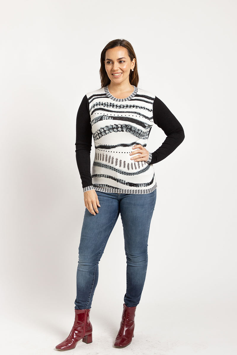 Descripción: Sweater con estampa y accesorios de piedras. Composición 80% viscosa y 20% nylon.