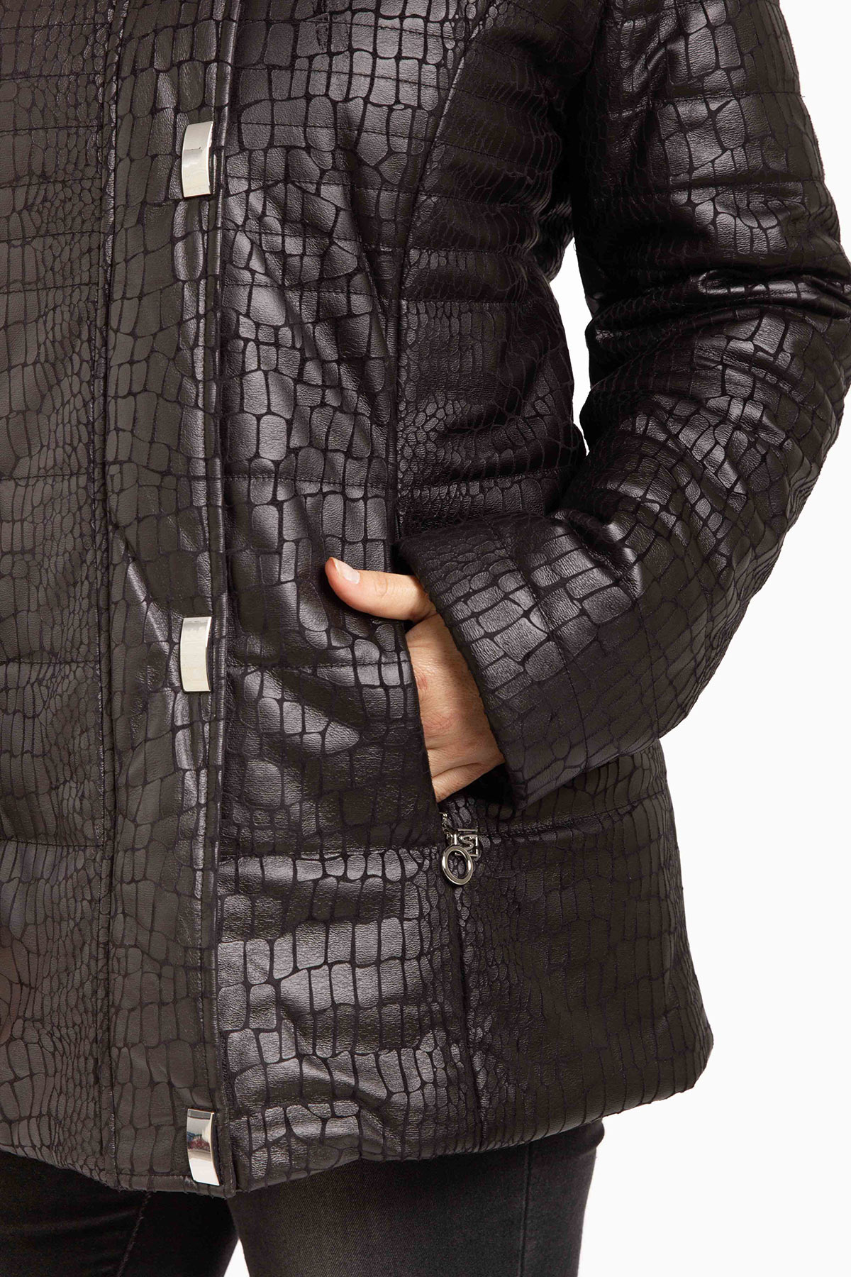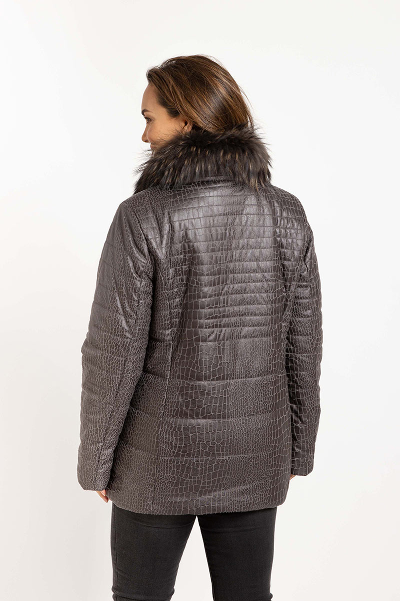 Parka en tejido simil reptil con piel desmontable. Broches y terminales de excelente calidad. Interior con bolsillo y bordado de la marca. Admite lavado en lavarropas.