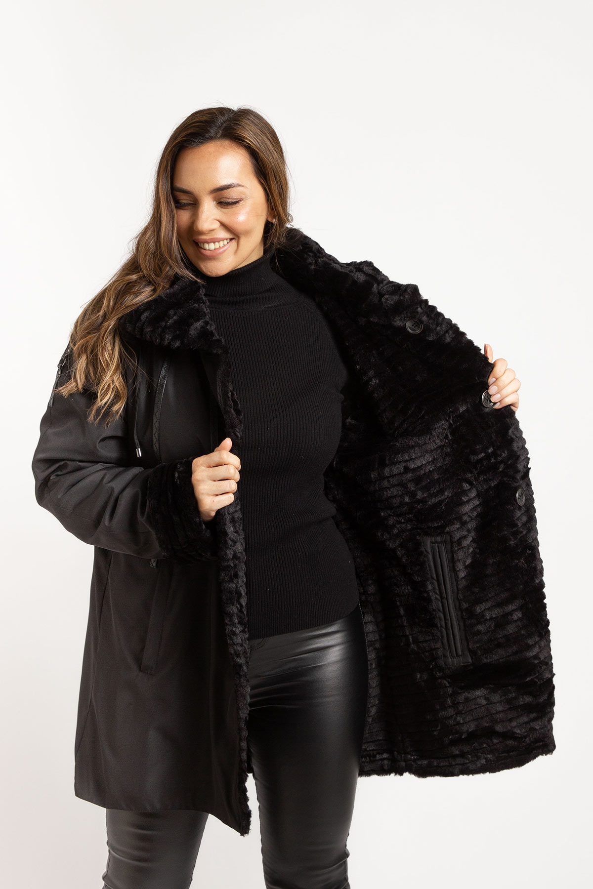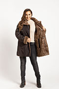 Parka reversible forrada en piel. Detalles de ecocuero sobre la tela. Bolsillos exteriores con cierre. Manga ranglan y molde acampanado. Admite lavado en lavarropas.