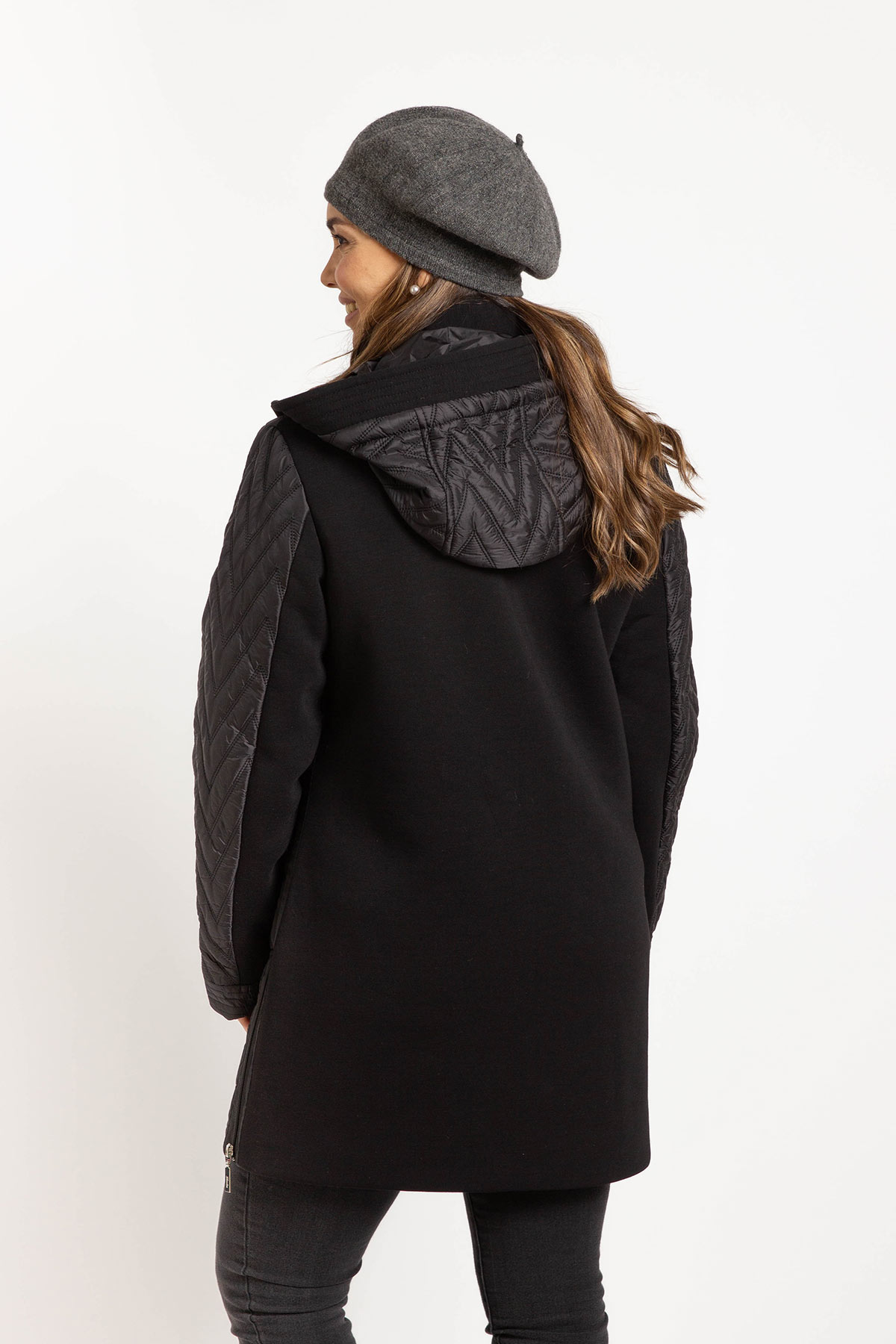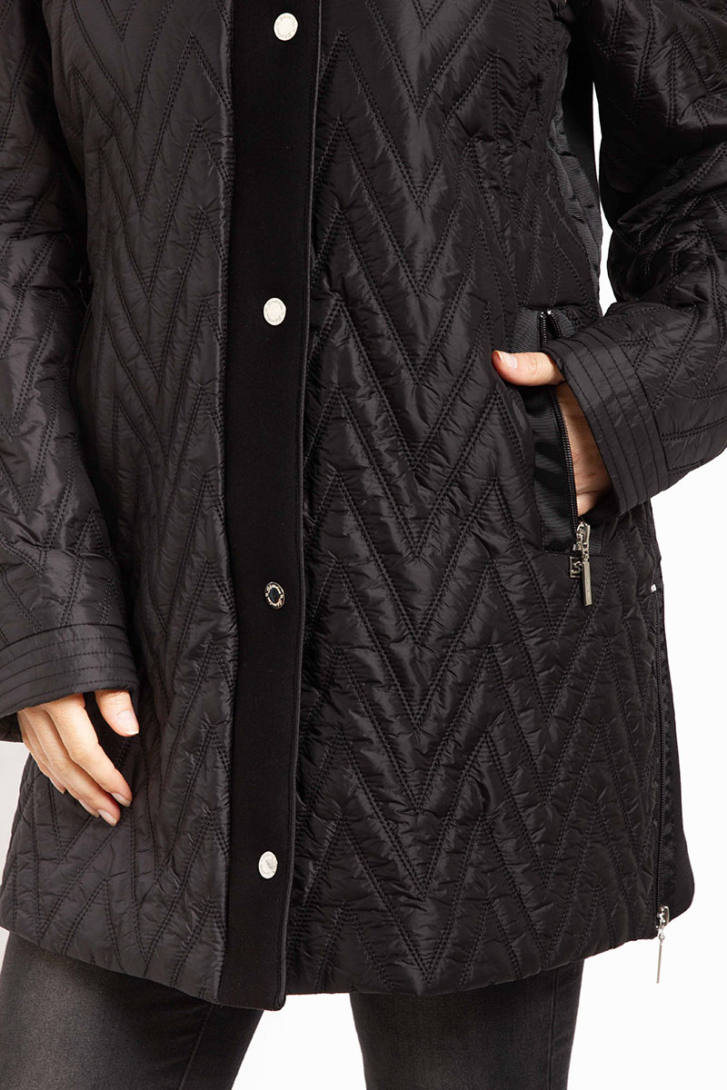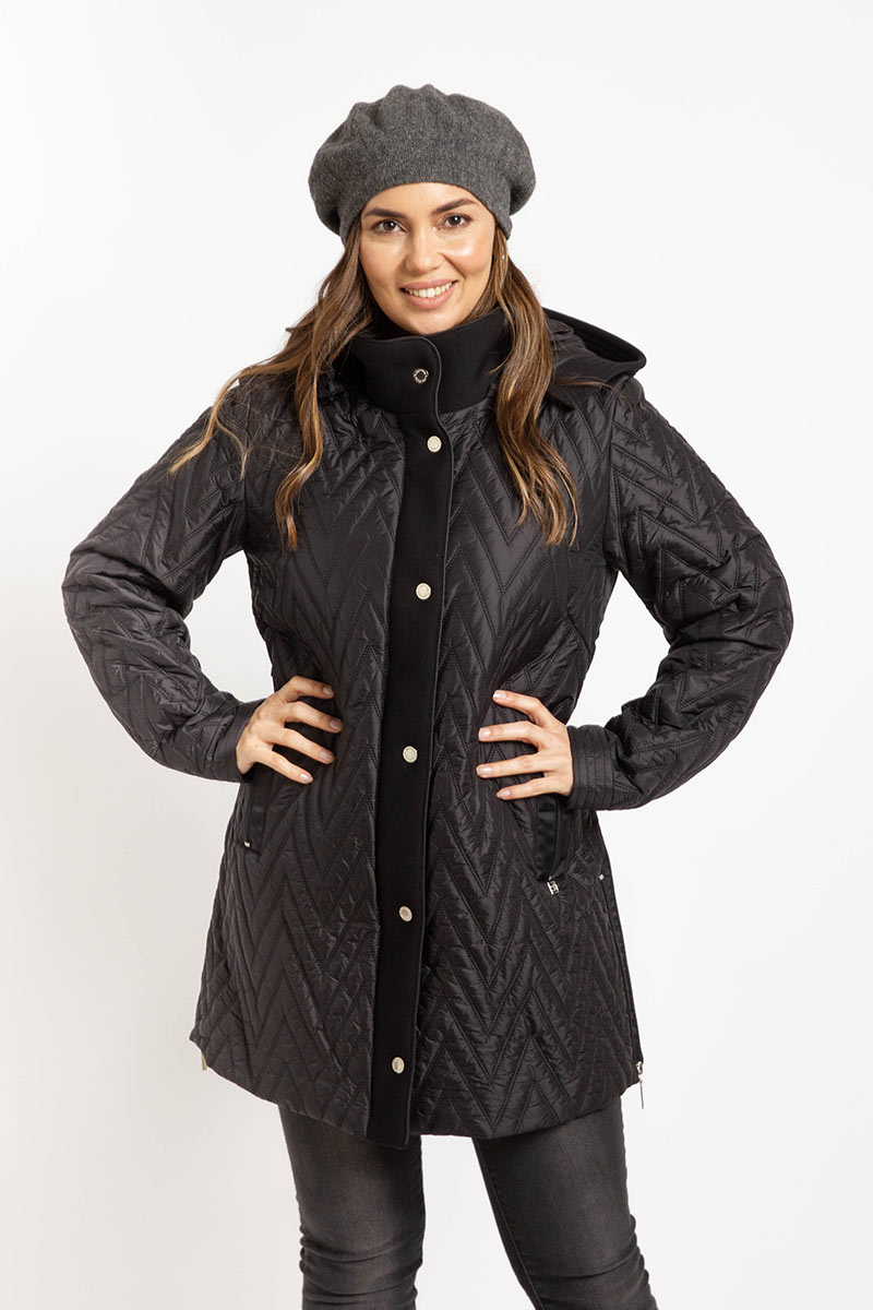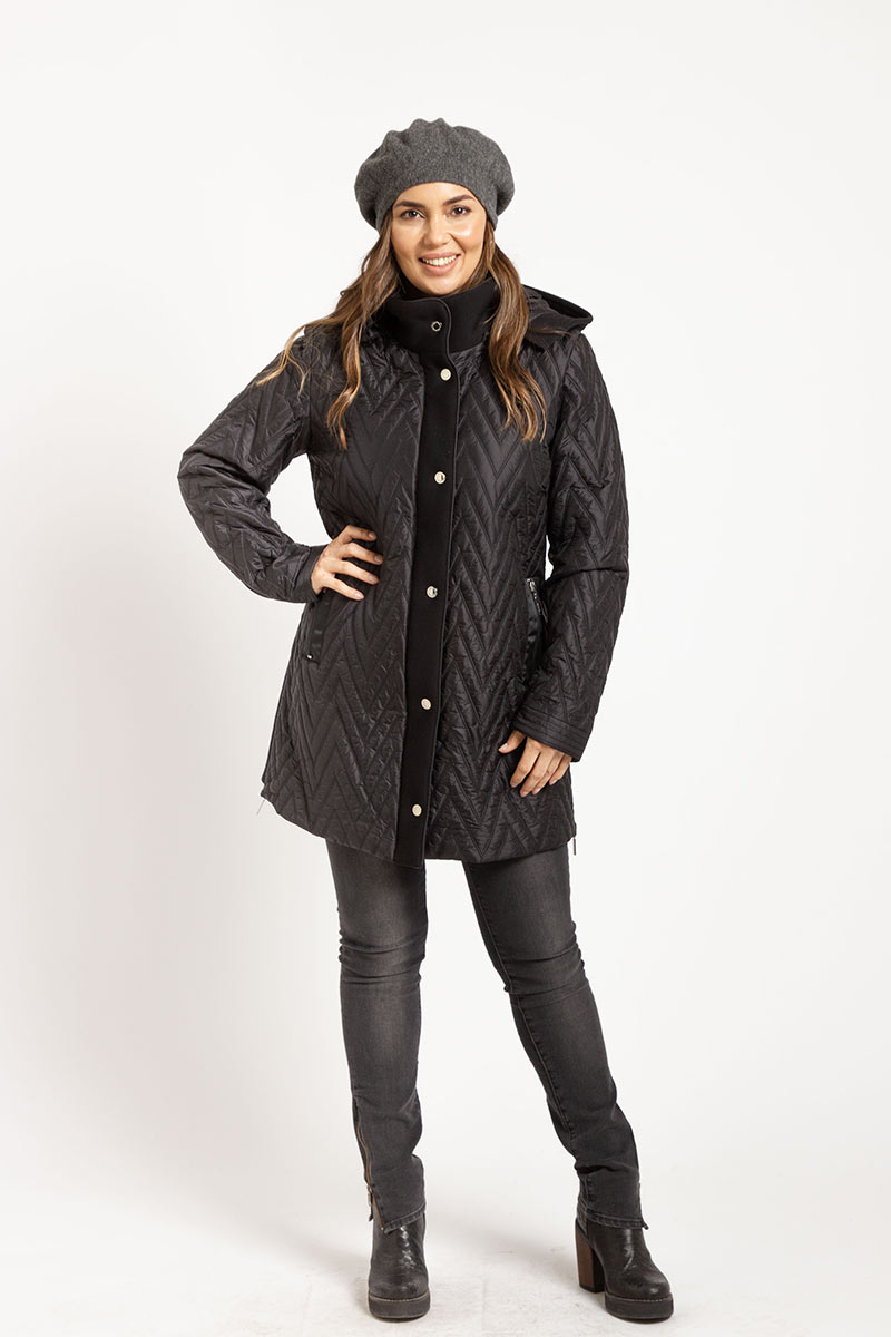 Parka matelaseada de corte moderno. Espalda y mangas con tejido tipo neopreno. Muy cómoda y liviana. Capucha desmontable. Bolsillo interior. Admite lavado en lavarropas.